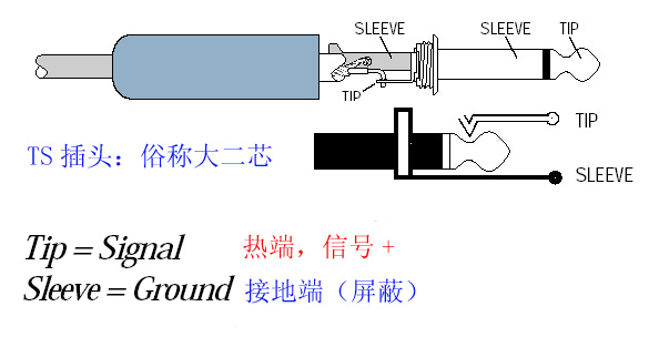 三、卡農(nóng)轉(zhuǎn)大兩芯線 卡農(nóng)轉(zhuǎn)大兩芯線是一種非平衡的接法,它一邊使用卡農(nóng)頭一邊使用大兩芯頭(又稱TS插頭),我們唱卡拉OK用的話筒就用這樣的線。由于卡拉OK用話筒通常都是動圈的,無須為其供電,因此要將卡農(nóng)頭的3端接地(與1端相連),2接熱端,1接電線的屏蔽層。如圖: